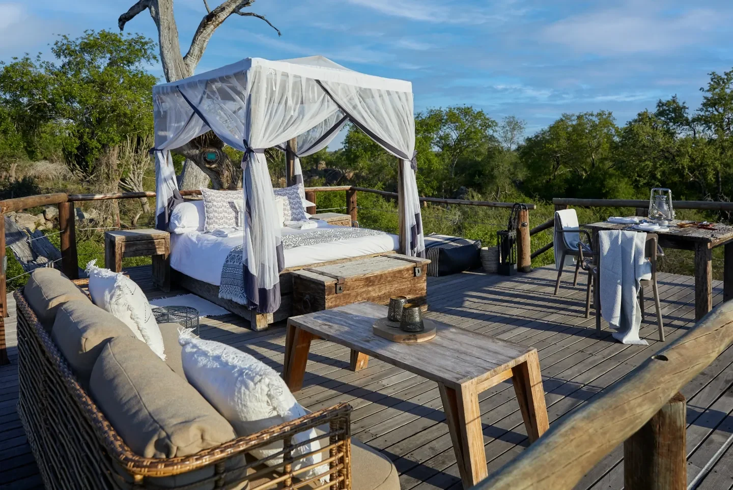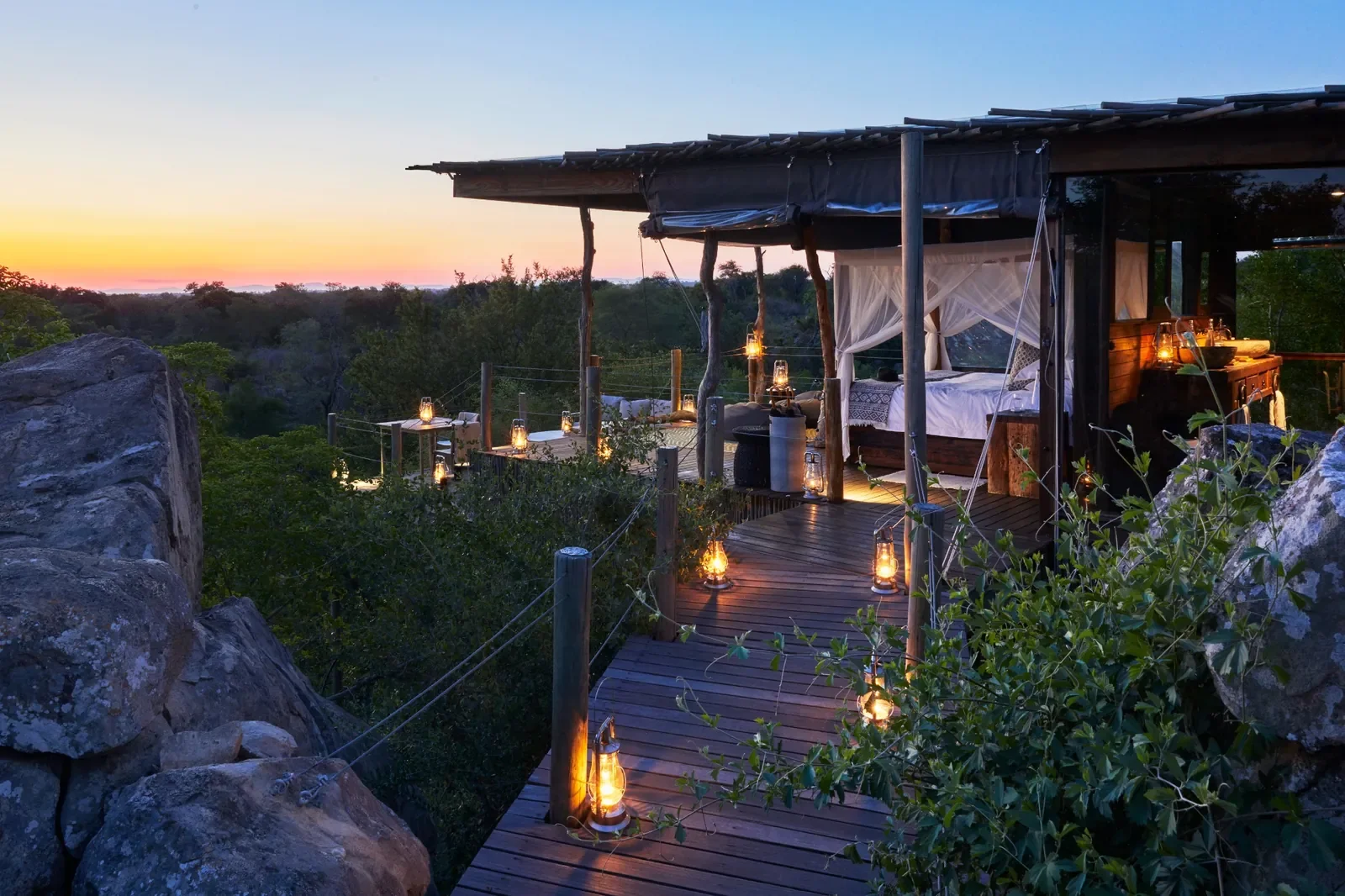 Imagine being guided to your private treehouse at dusk, lanterns glowing as the bush comes alive at night. From your elevated deck, enjoy sundowners with sweeping views before retreating to a plush four-poster bed under the Milky Way, drifting to sleep with the sounds of the wild below.