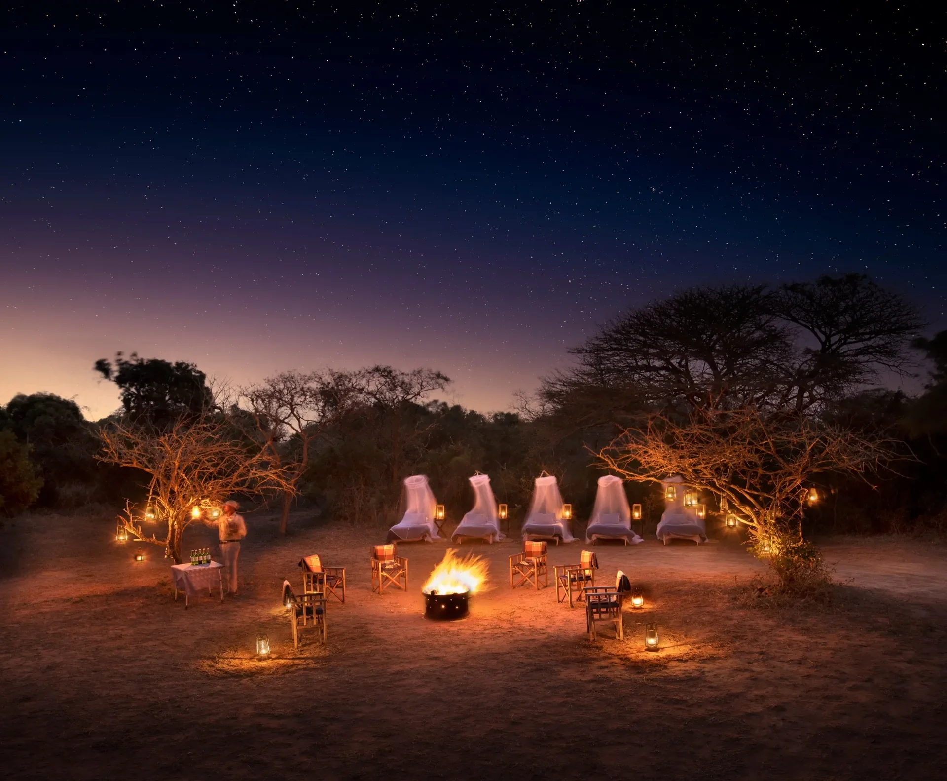 An under-the-stars sleepout is the purest way to connect with Africa. Raised decks, star beds, and lantern-lit bush platforms offer a safe yet thrilling night in the open. Cocooned in comfort, you fall asleep under vast skies, surrounded by nocturnal sounds and wilderness magic.