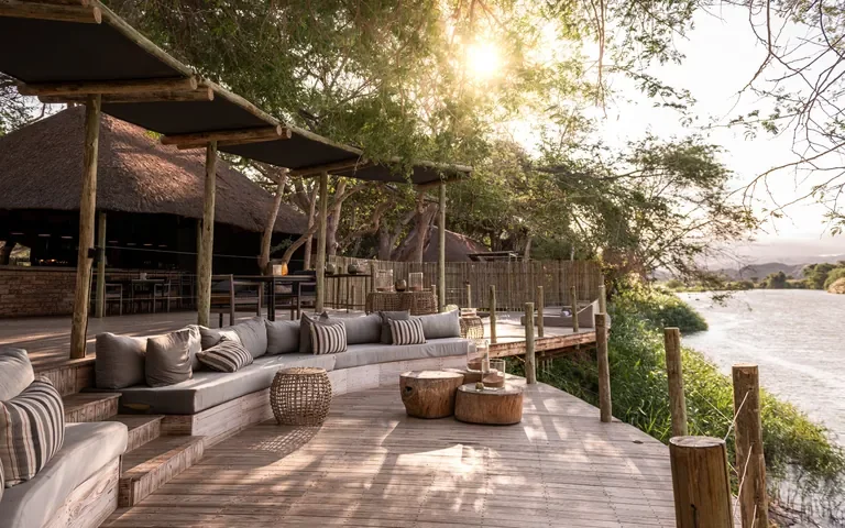 Each suite features a king or twin-size bed draped in mosquito netting, a sunken lounge with armchairs and a writing desk, and en-suite bathrooms with both indoor and outdoor showers, double basins, and locally inspired décor. Floor-to-ceiling glass doors open onto a wrap‑around veranda with a hammock and shaded bench, ideal for private dining or simply soaking in the stunning river and desert views.