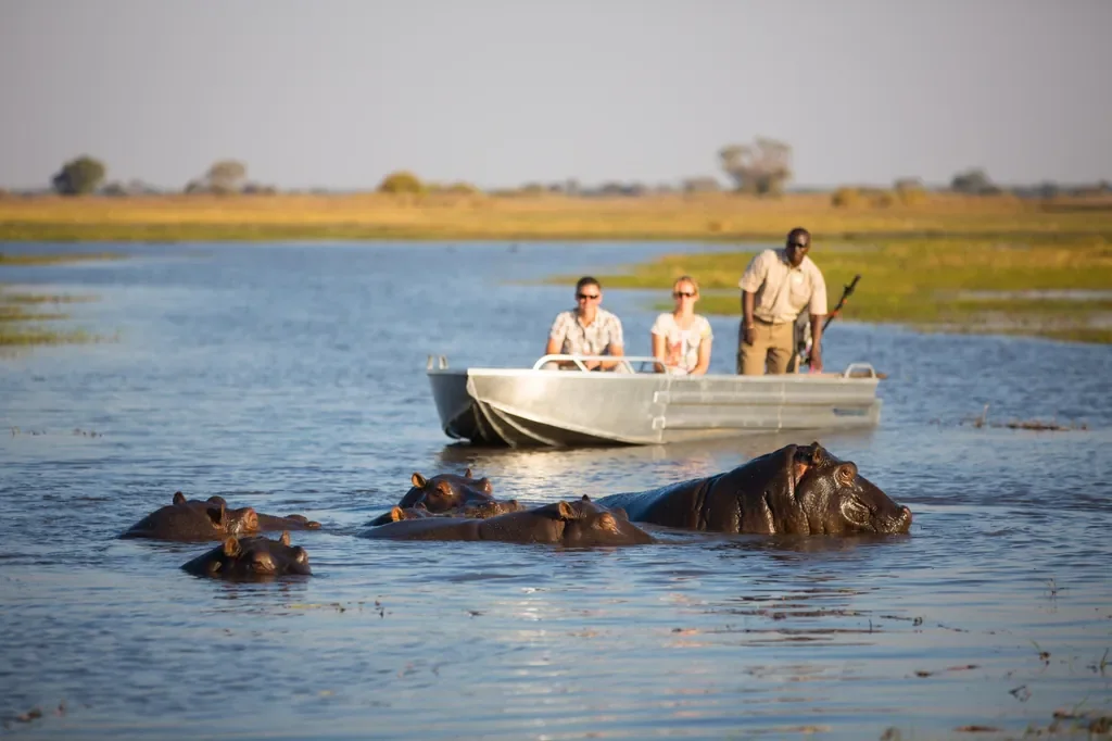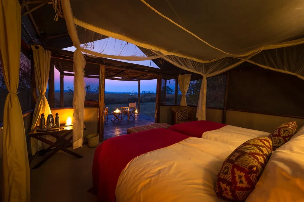 Morning and afternoon game drives sweep across roughly 600 km² of seasonally inundated plains, with prolific puku, red lechwe and roan, and big lion prides. After dark, exhilarating infra-red spot-lit night drives reveal leopard and other nocturnals. Early in the season, when waters still linger, take boating excursions through hippo-lined channels for superb birding. Back at camp, savour bush brunches and lantern-lit dinners beneath the trees; private dining is easily arranged. Optional in-tent massage treatments are available. Expect sunrise mists, golden light and generous time at sightings for photographers.
